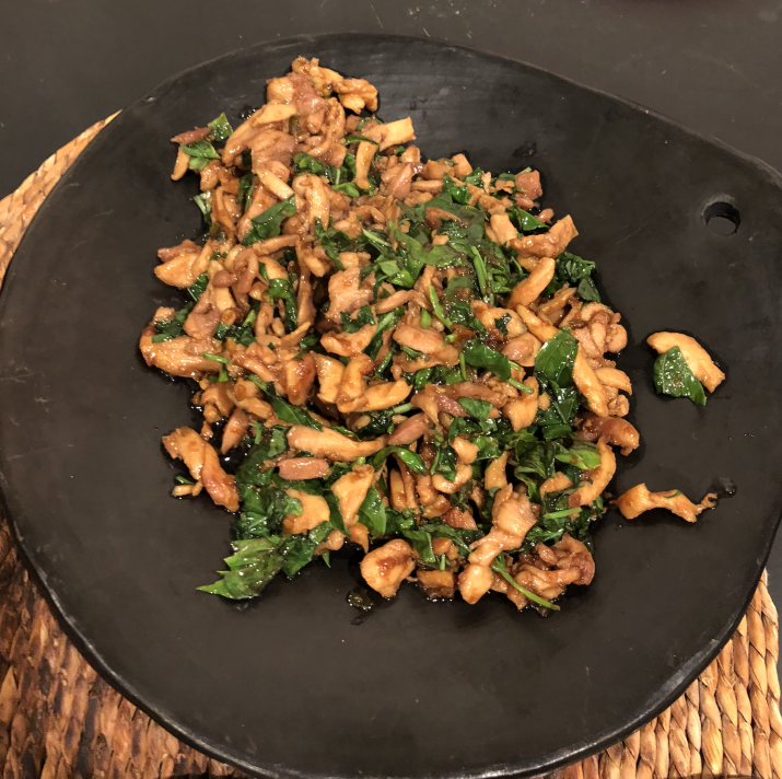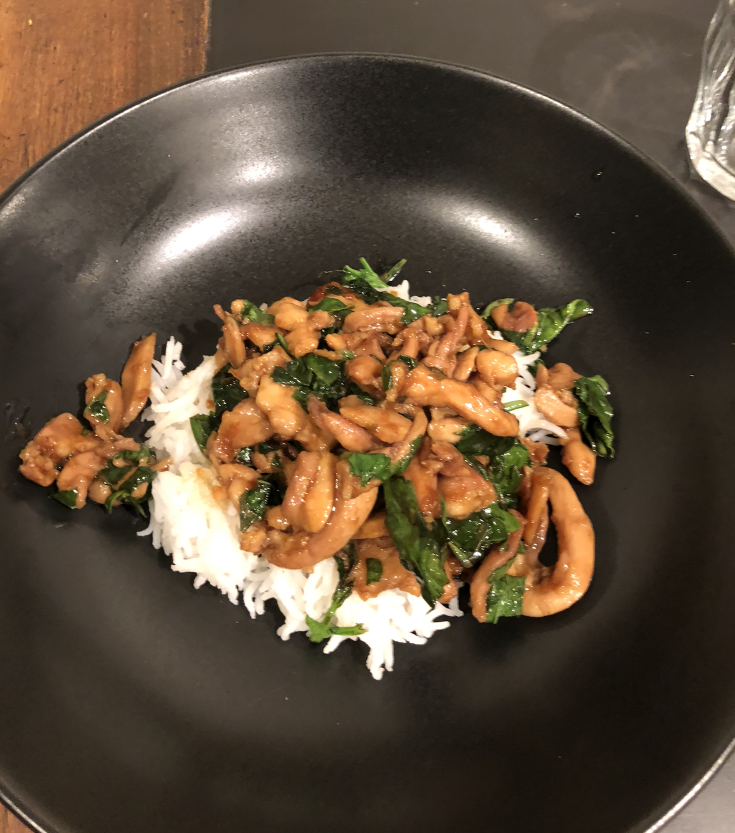 Add the basil, stir for 10 seconds then take off the heat and serve over rice.