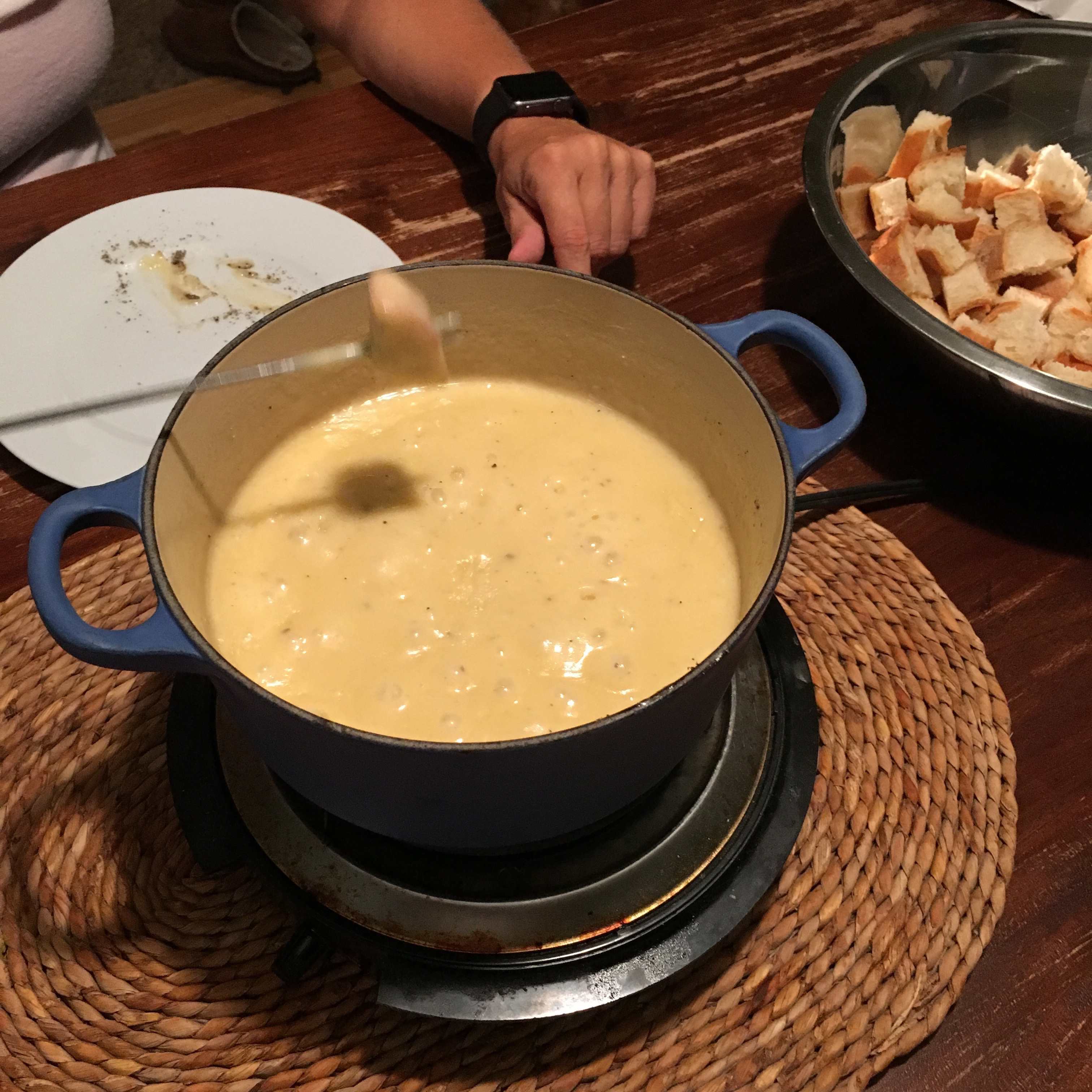Bring the pot at the table, keep the heat on medium or so (light boil), you will see the cheese tends to firm up if it gets too cold (btw, until someone throw a fork with bread into the pot, you are still stirring the fondue ).
