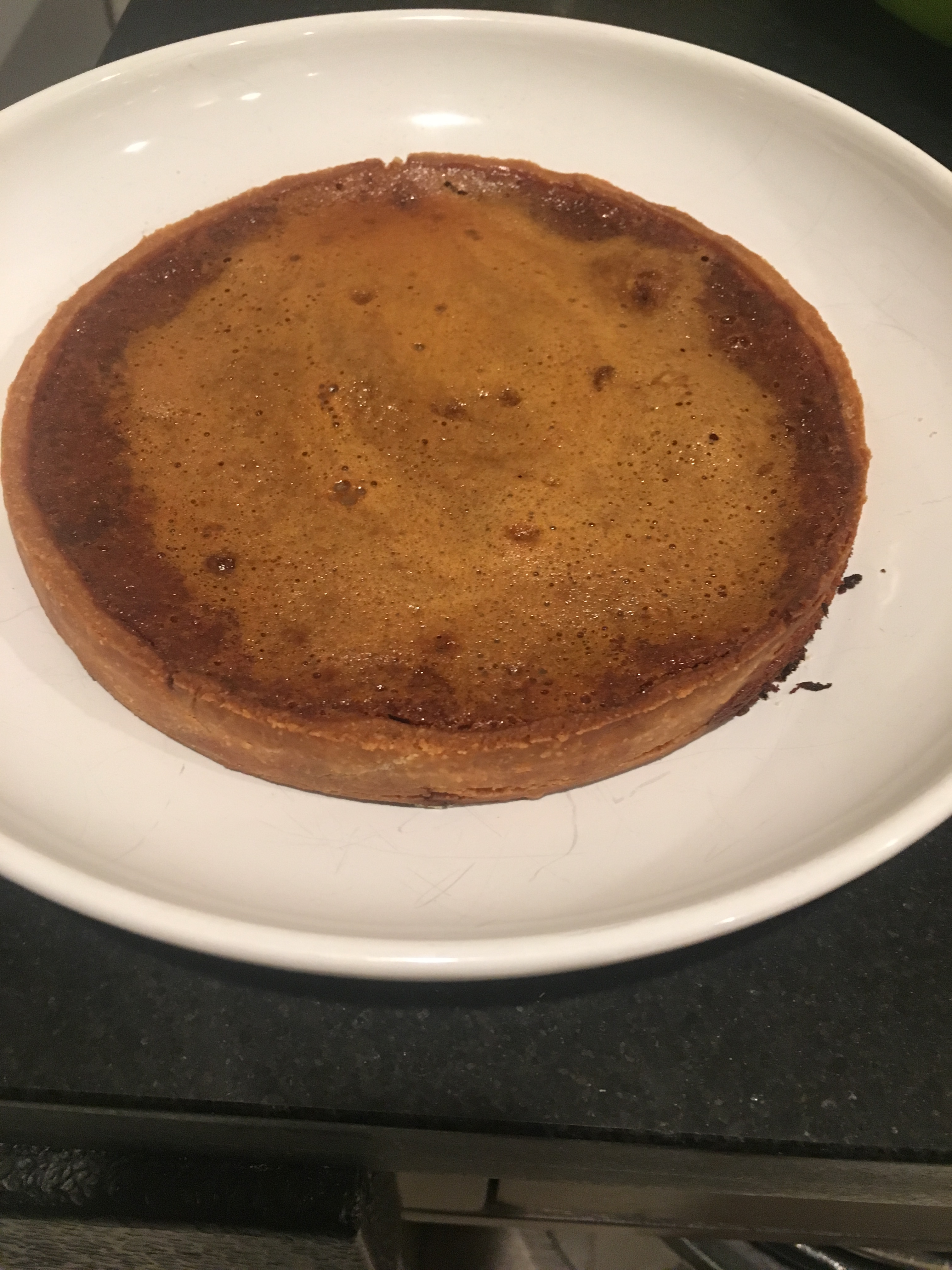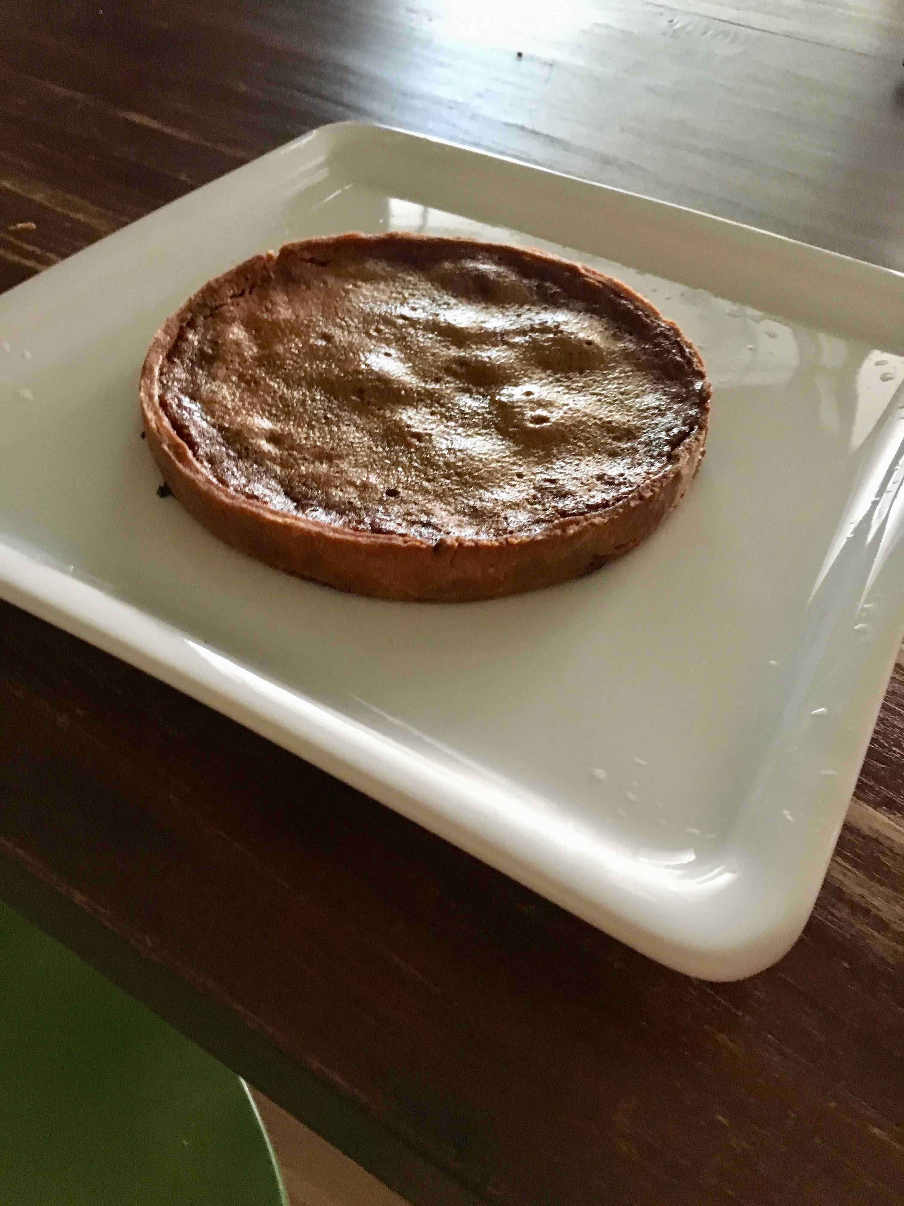- Lay the dough (fonce) in the pie plate, and cover the center with a aluminium disk, 10 mn into the cooking remove the disk