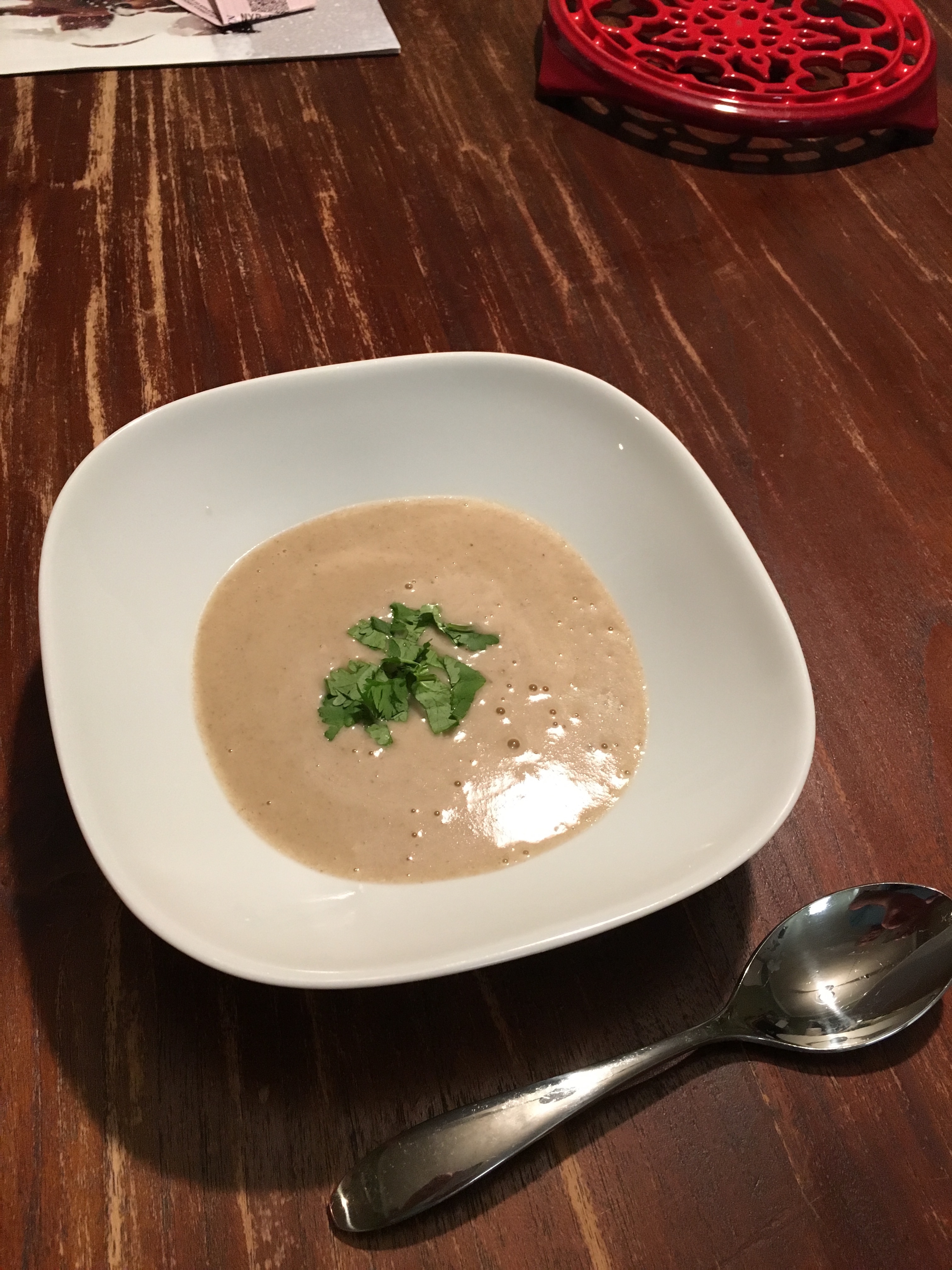 - Blend the soup, add the cream and mix again