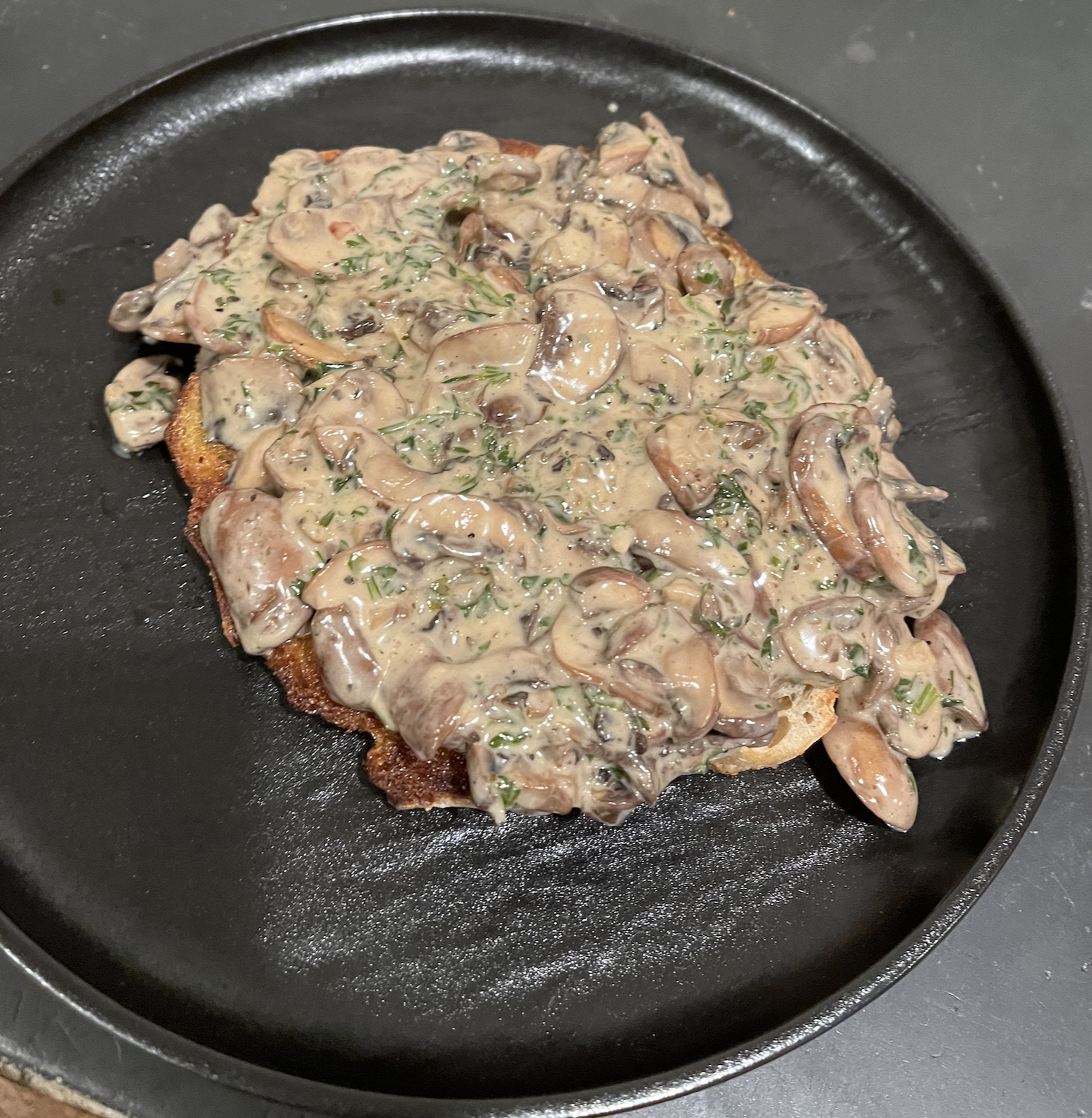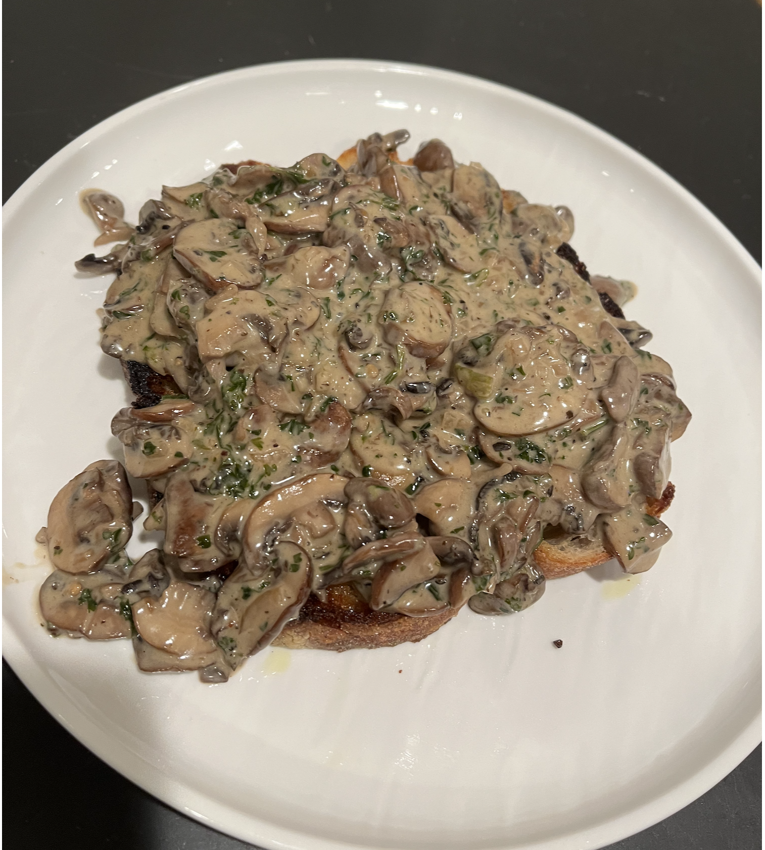 - Place the bread on a plate and laddle the mushroom on top of the bread, then serve