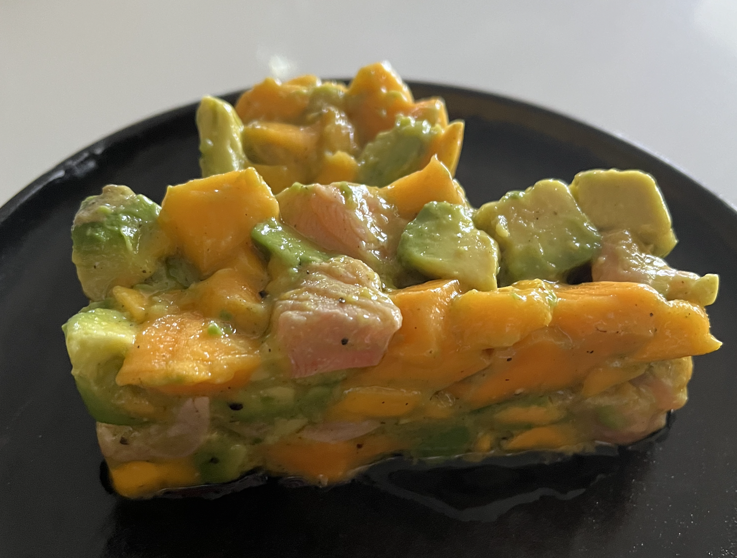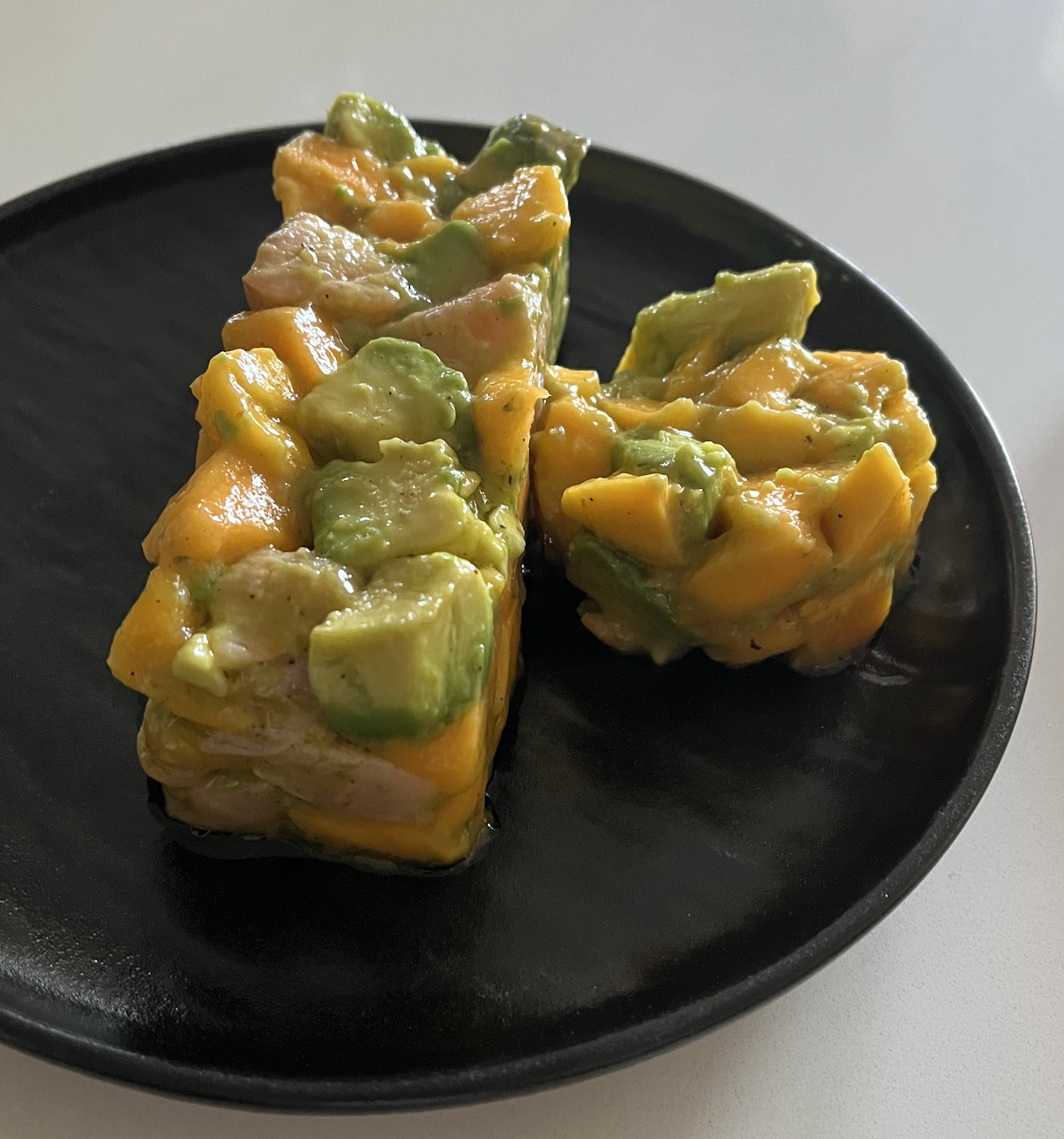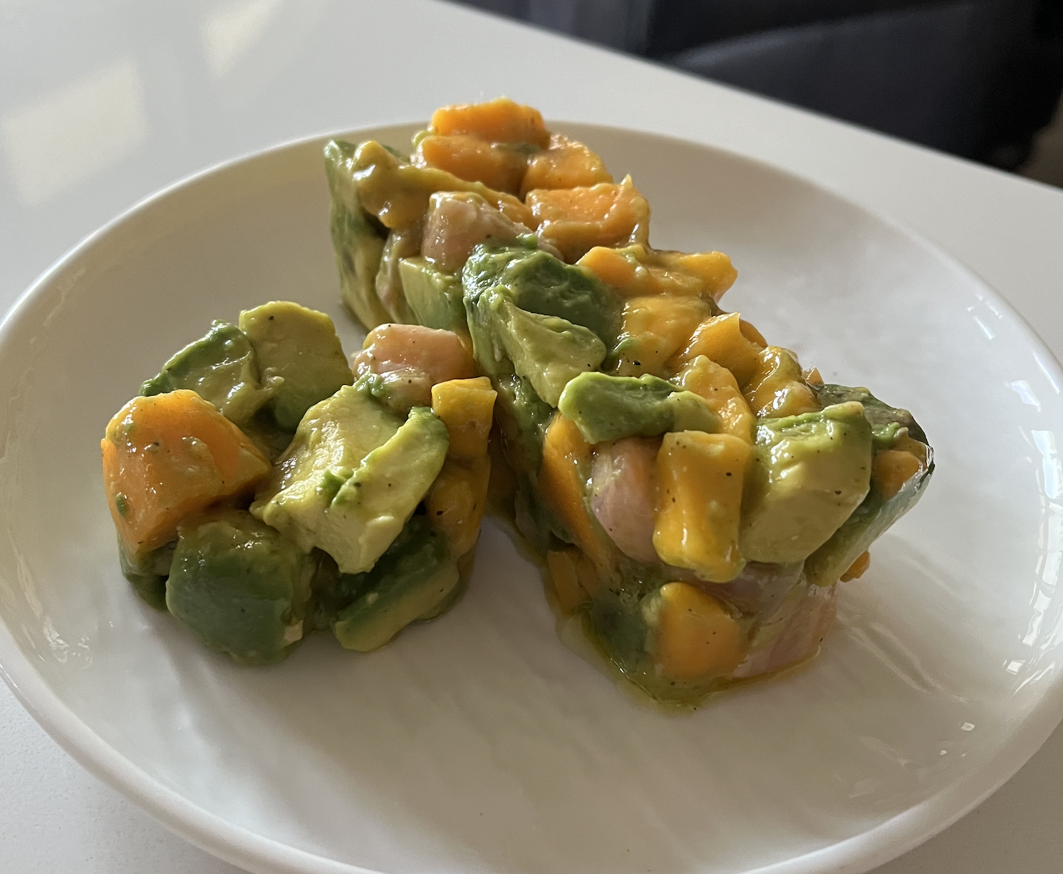 - Peel and brunoise (cut in small bits) the mango (I did the mango too big on the first try) and the avocado.