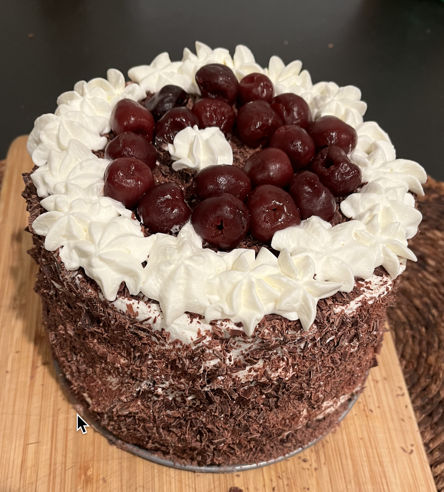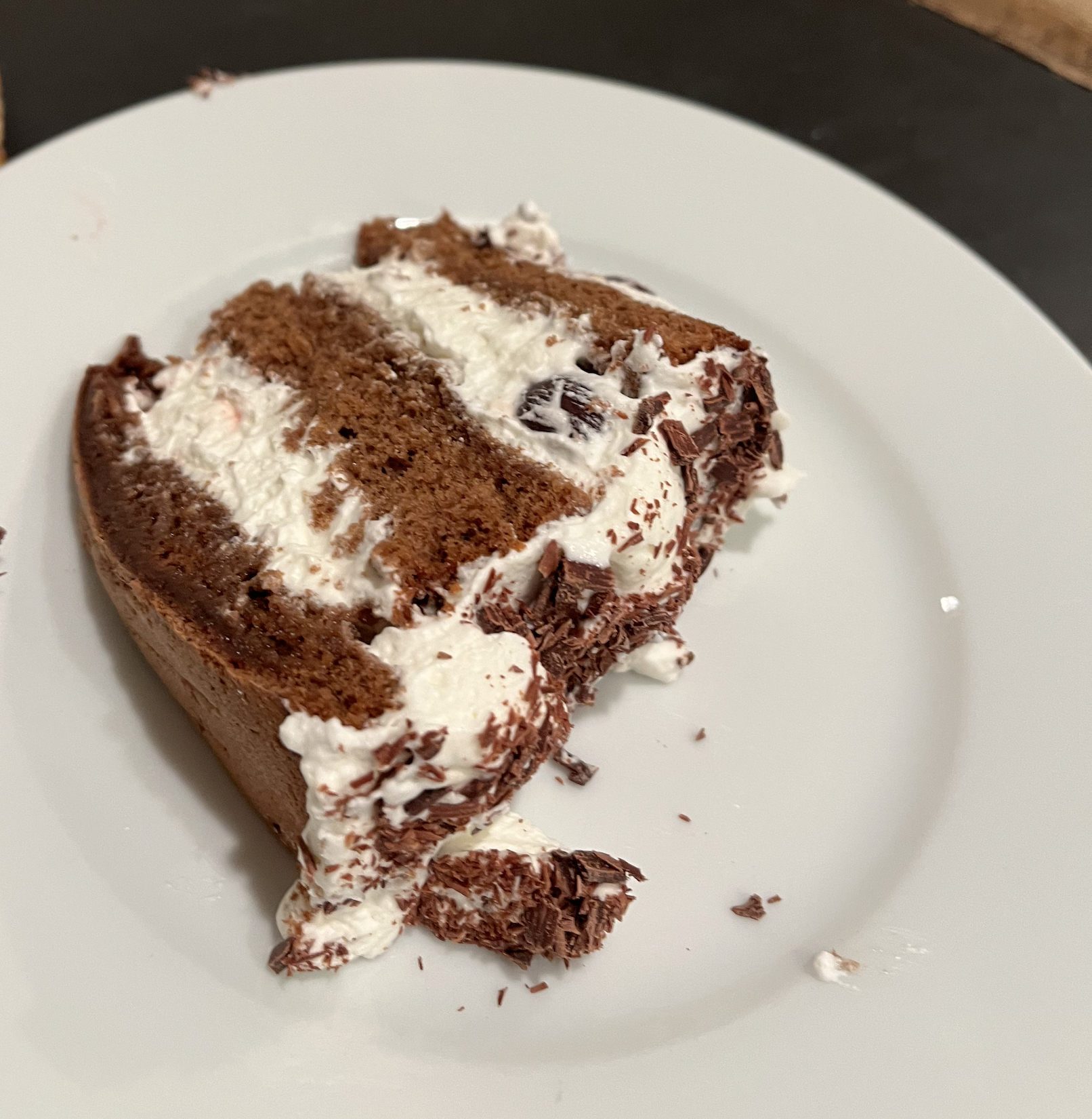 - Decorate the top with the last 1/4 of cream and remaining cherries and chocolate scrap