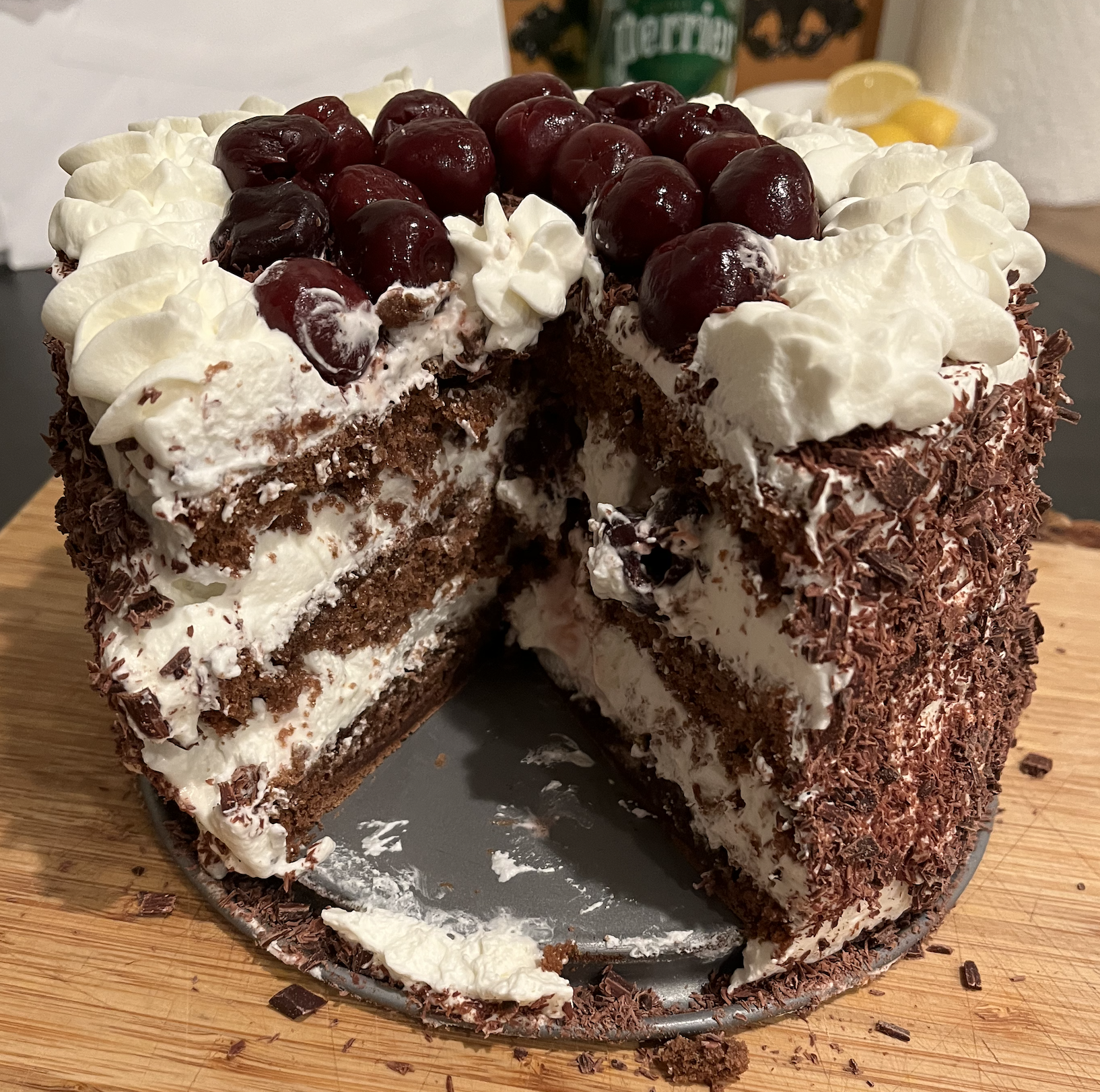 - Repeat: brush with sirup, add cream, add cherries (keep a few aside for the top decoration)