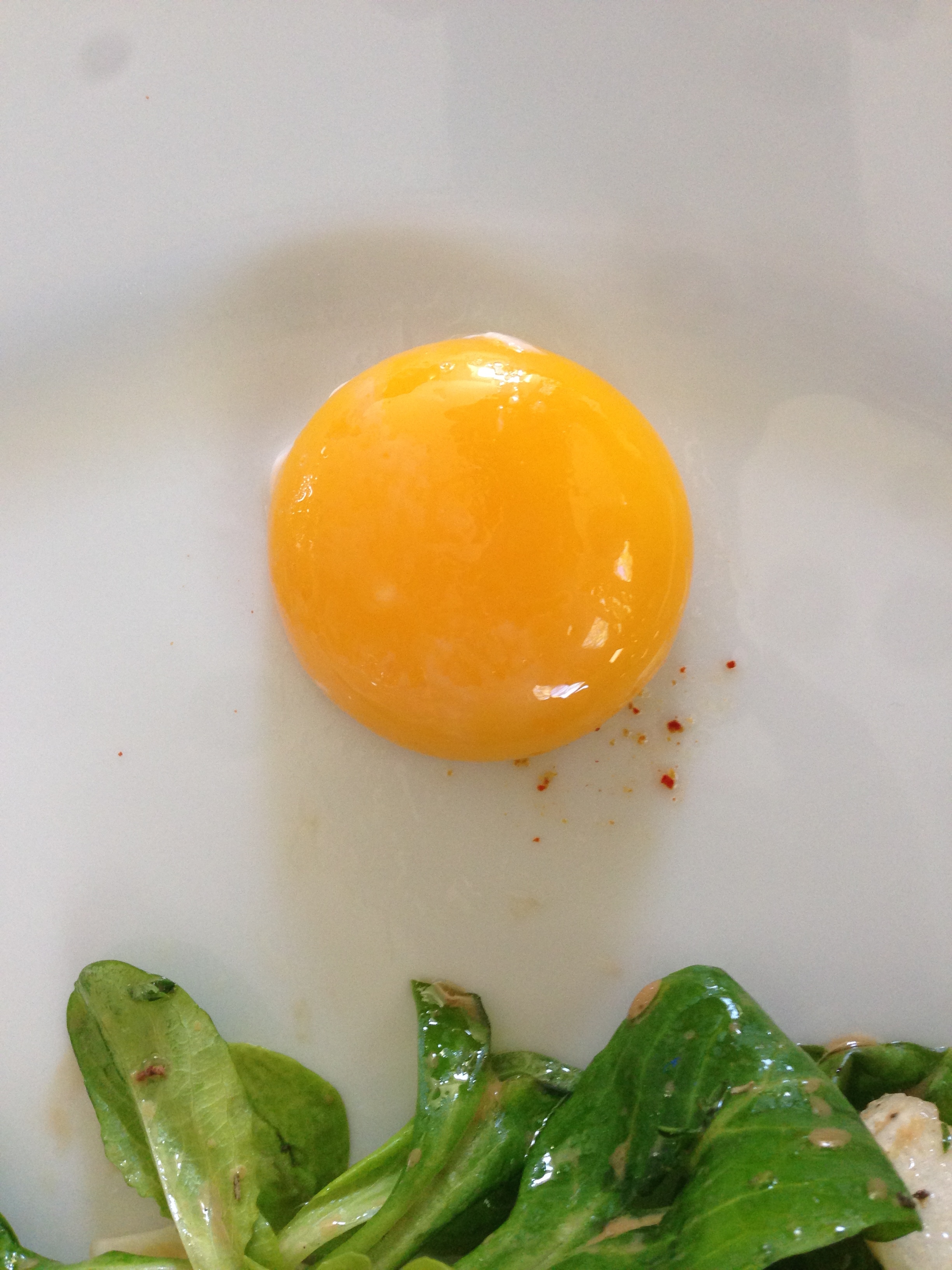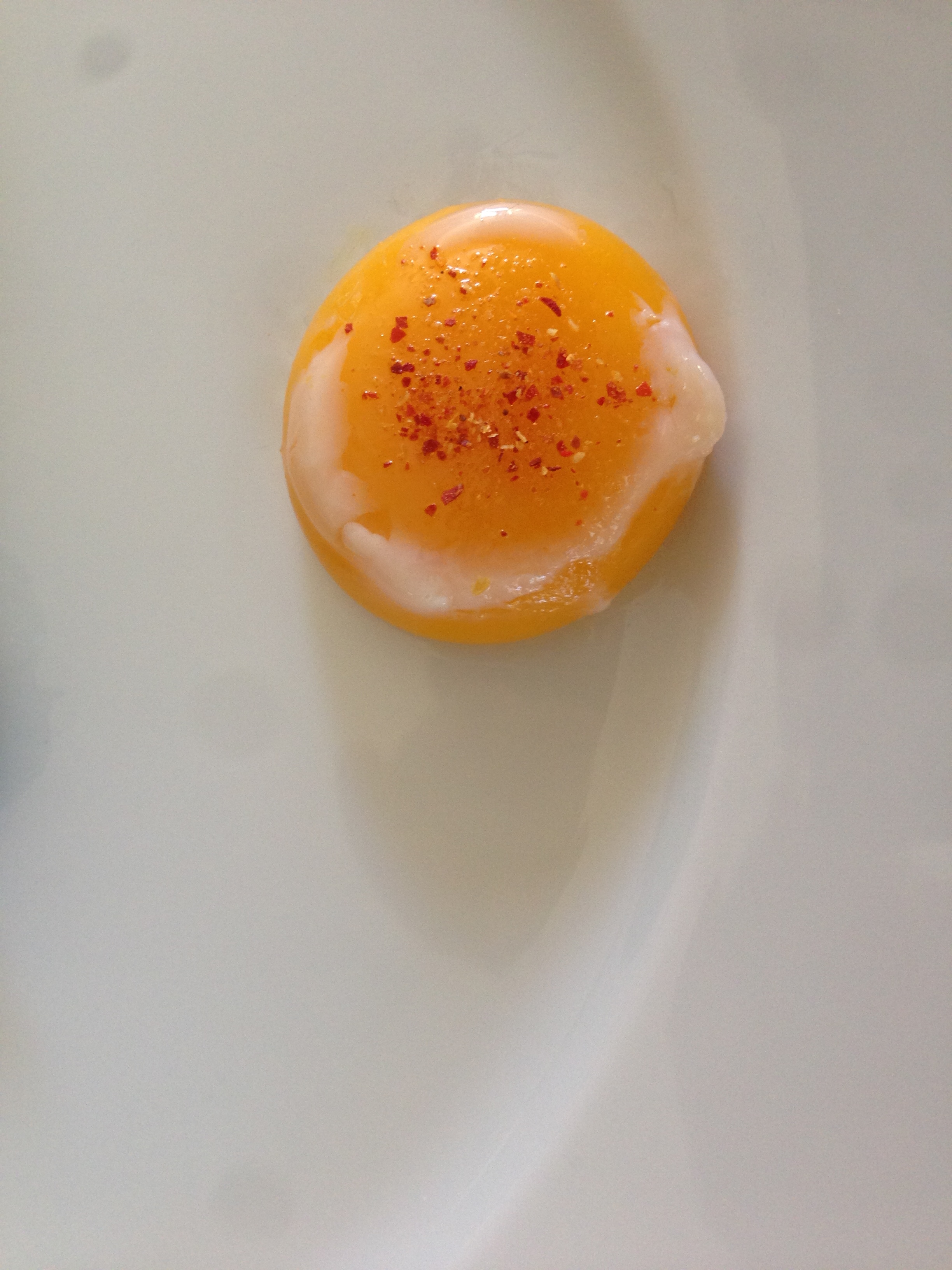 - Carefully separate the yolk from the white and place the yolk into the oil bath. Be sure the yolk is intact, otherwise it will just run down in the oil bath. Try to remove all the white as it will look nicer. If you do not have a metal container, use a zip lock bag.