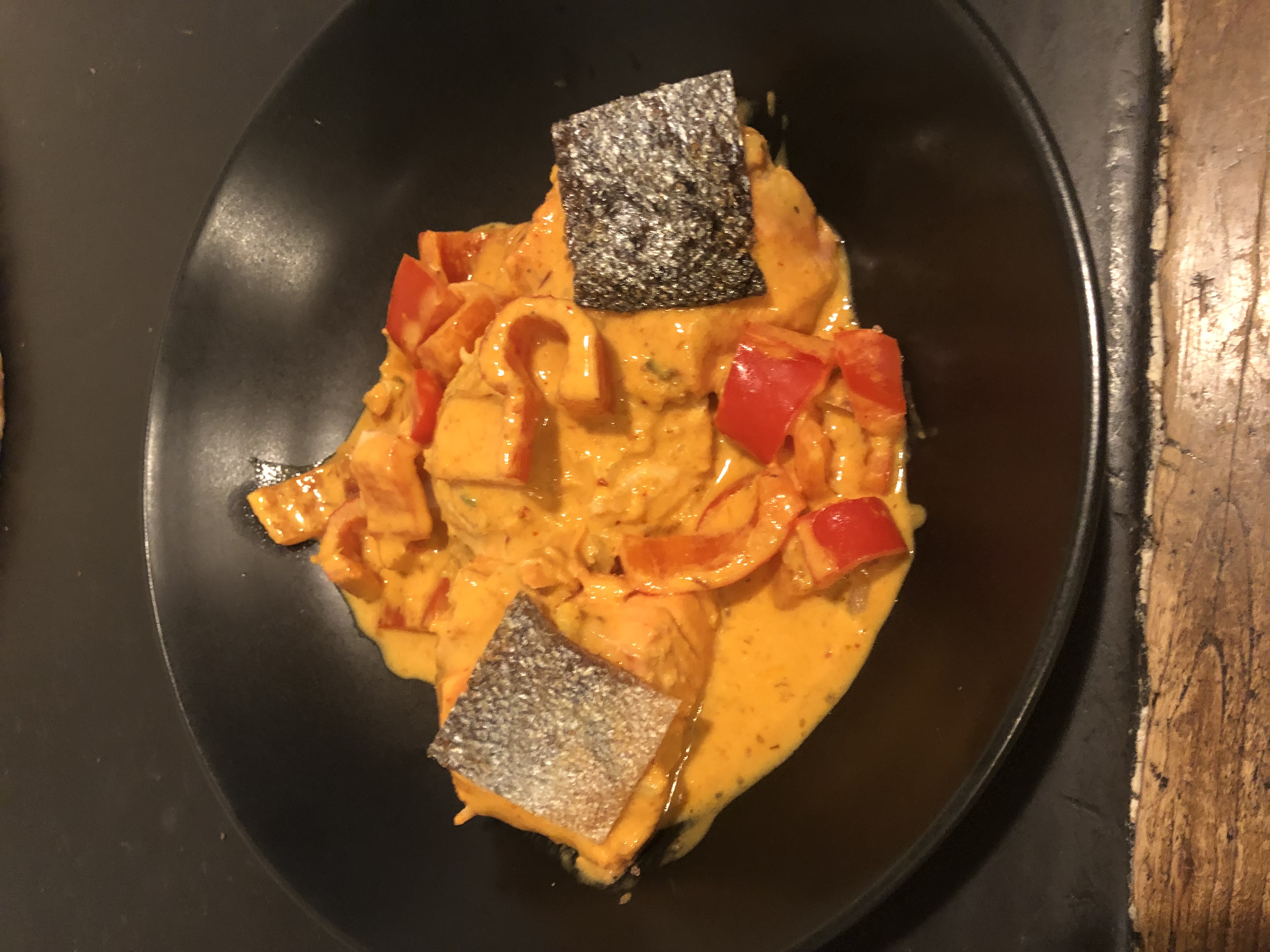 You may have notice the grilled salmon skin in the picture. To do it, I simply place a skillet on the stove, a tiny bit of oil, place the salmon skin down, place a glass container on top of it (to keep the skin from folding over itself) then turn the hear to low. I start this when I start the curry, turning the skin over mid-way.