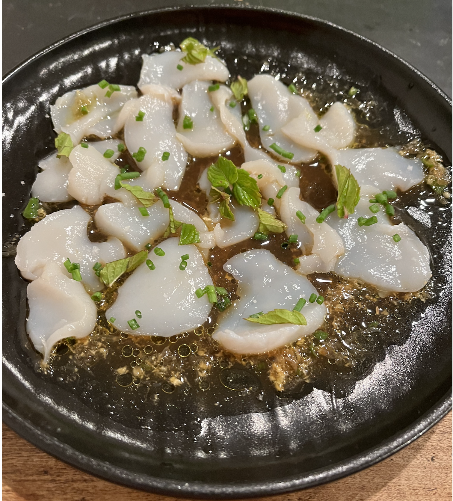 Place the scallops in the freezer for 10-15 minutes to make them easier to slice thinly