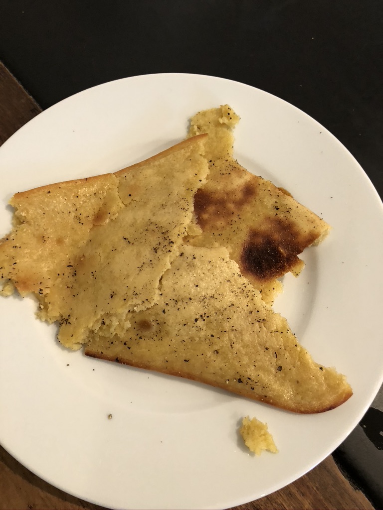 Take the pan out, break the socca in square, and crack black pepper over the socca and serve.