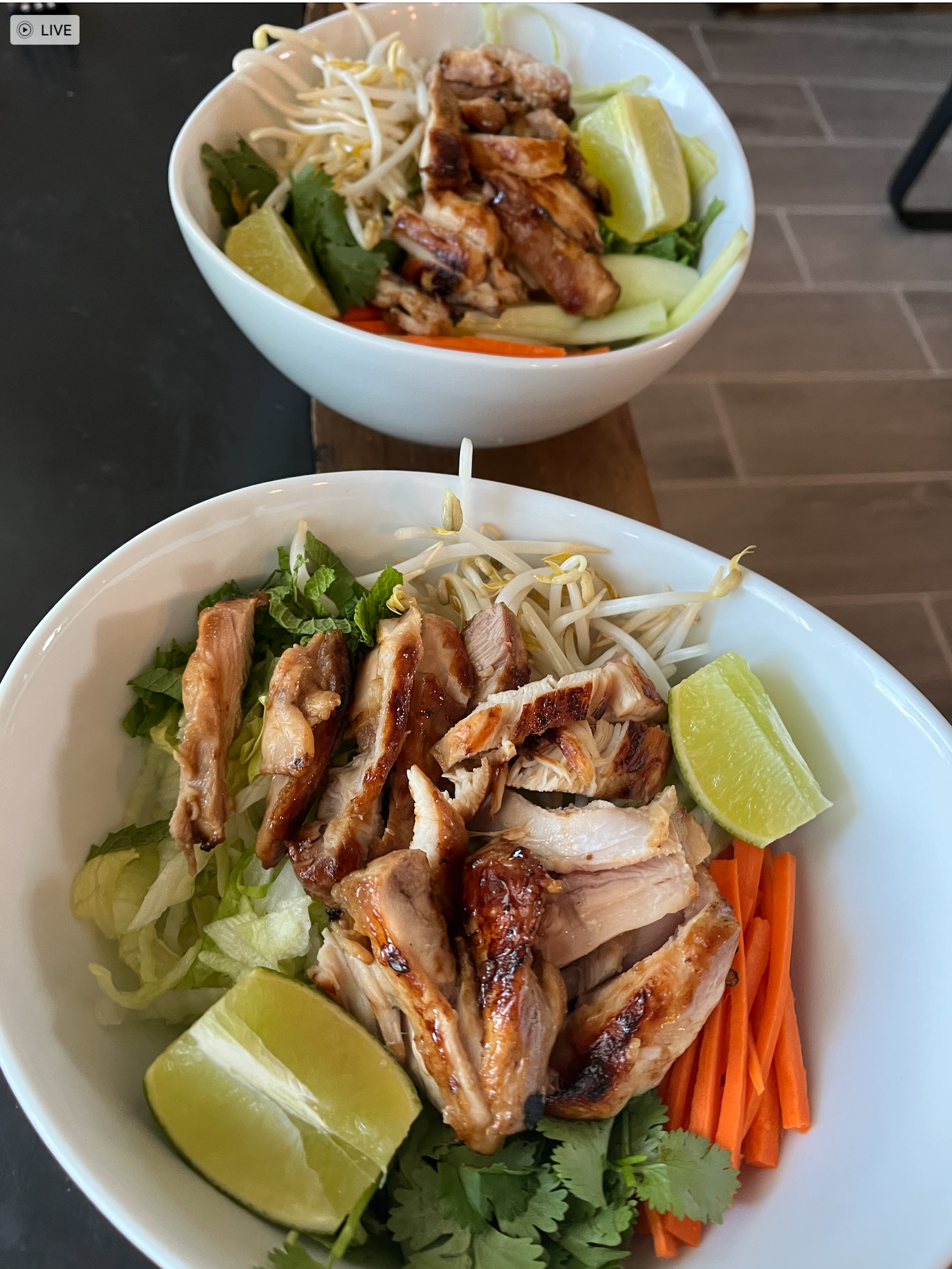 In a bowl, add noodles and all the ingredients, chicken on top, then some mint and coriander